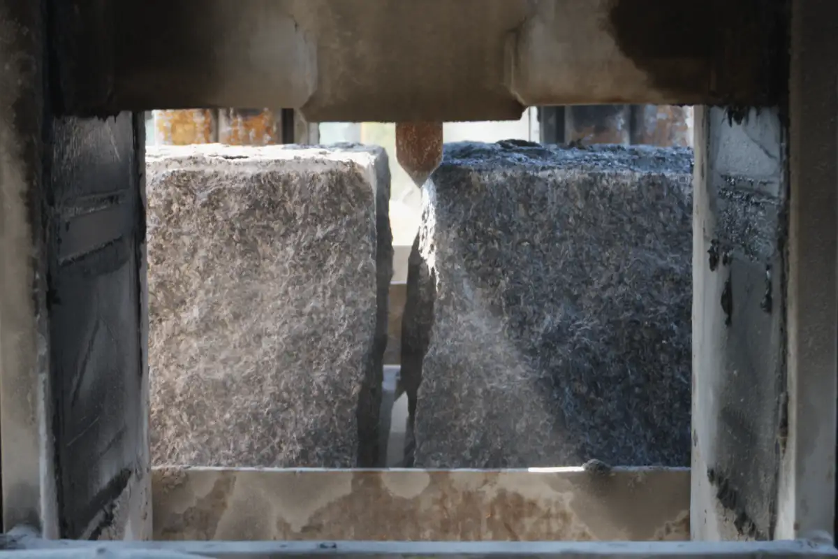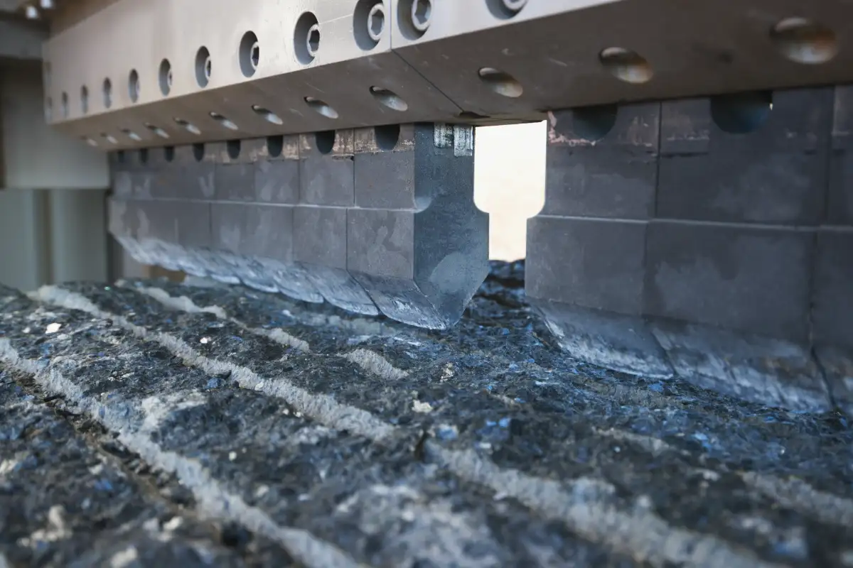 When splitting large blocks, small waste falls down the machine and conveyors into a channel where it is continuously removed. This minimizes unproductive cleaning time and prevents potential damage to the machine from accumulated waste.